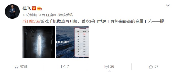 今天下午,努比亚技术有限公司总裁倪飞在微博上表示,红魔 5s 的散热系统再度升级,首次采用了世界上导热率最高的金属工艺——银。