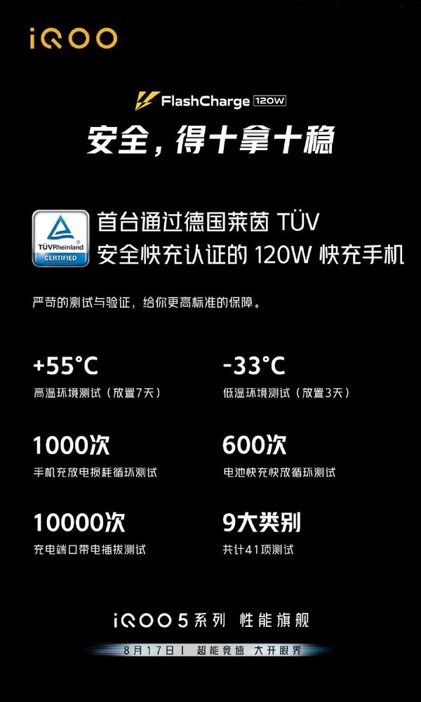 在充电安全性方面,iQOO 5成为了首台通过德国莱茵安全快充认证的120W快充手机,严苛的测试与验证,为用户带来了更高标准的保障。在+55℃高温环境中要放置7天,在-33℃低温环境中要放置3天,手机充放电损耗循环测试1000次,电池快充快放循环测试600次,充电端口带电插拔测试10000次,共计9大类别41项测试。